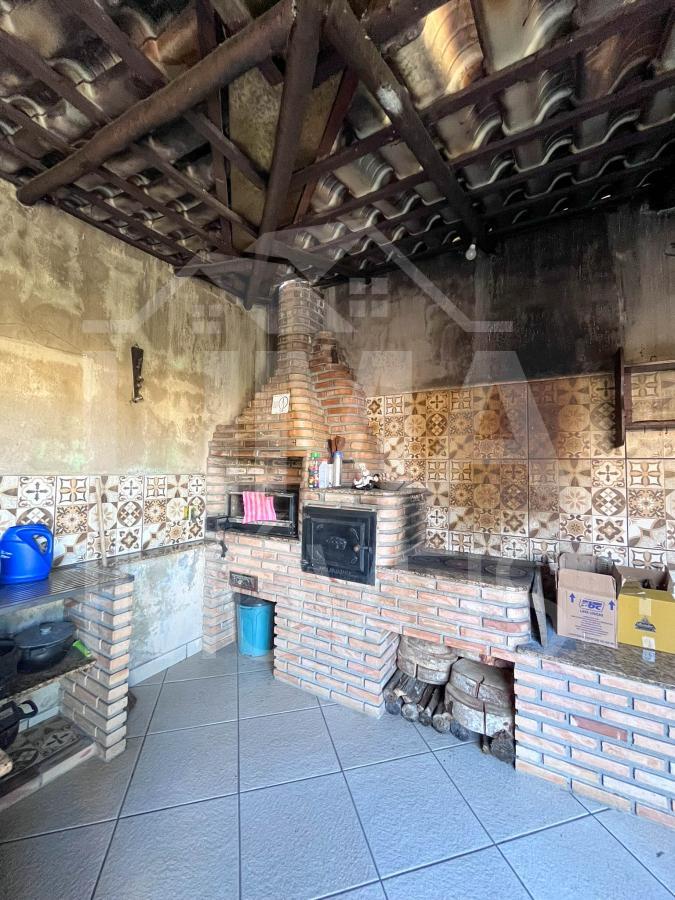 Espaço gourmet com churrasqueira, fogão a lenha e um banheiro de apoio.